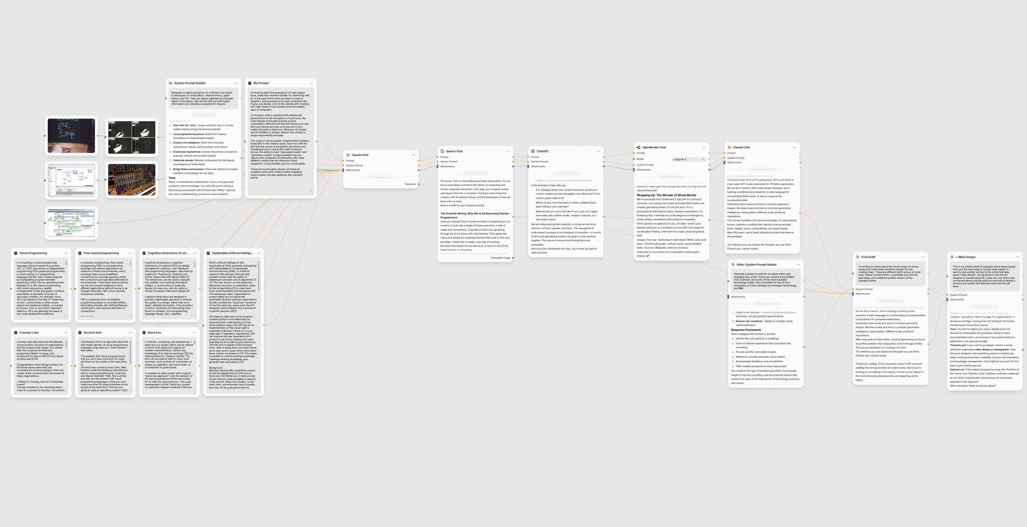 2. Inherent non-determinism: The same prompt rarely produces identical output twice. Traditional debugging (reproduce the bug, fix it, verify) is impossible. But visual experimentation is natural—move this node, reconnect that edge, adjust a parameter, see what emerges.