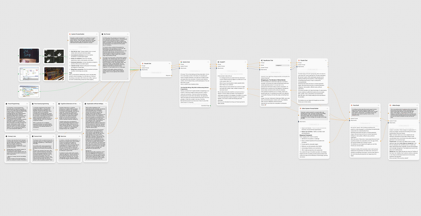 Node-based canvases nail it. They map directly to the graph structure of creative thought. They don’t just allow compositional thinking—they encourage it. They make dependencies explicit and experimentation cheap. Reconnecting a wire is easier than rewriting a script.